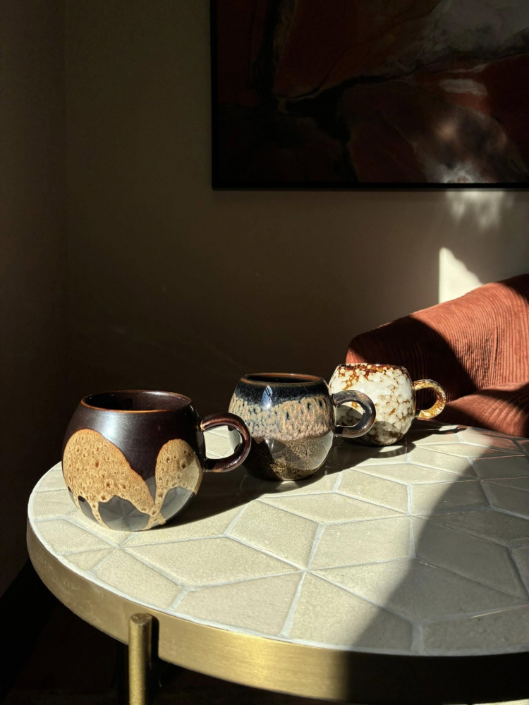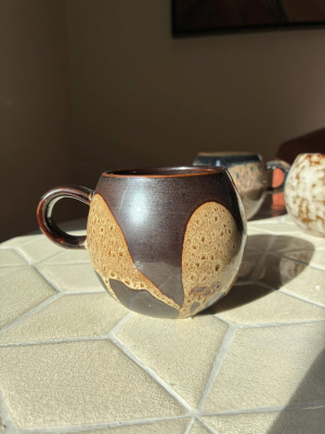 This striking black mug is elevated by a taupe hand-splashed glaze, creating a unique, organic pattern on each piece. The contrast between the deep, matte black base and the fluid, expressive glaze adds a modern yet artisanal touch.