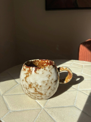This charming mug features a warm toffee-colored base, beautifully accented by a speckled white glaze that adds depth and texture.