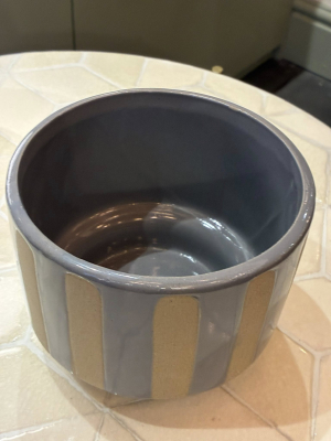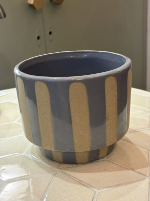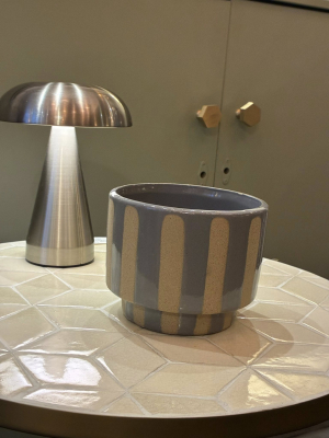 A contemporary stripey grey plant pot, featuring alternating tones of soft and deep grey that create a subtle yet striking pattern. Its clean cylindrical shape and neutral palette make it a versatile piece, perfect for complementing both modern and rustic interiors while letting your greenery take centre stage.