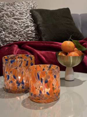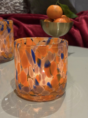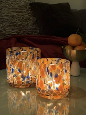 A playful yet elegant yolk yellow and blue spotty glass tealight holder, where hand-blown glass is scattered with Bright blue & yolk yellow dots.