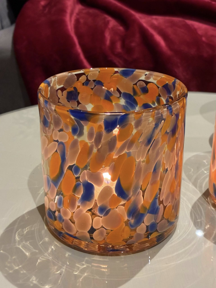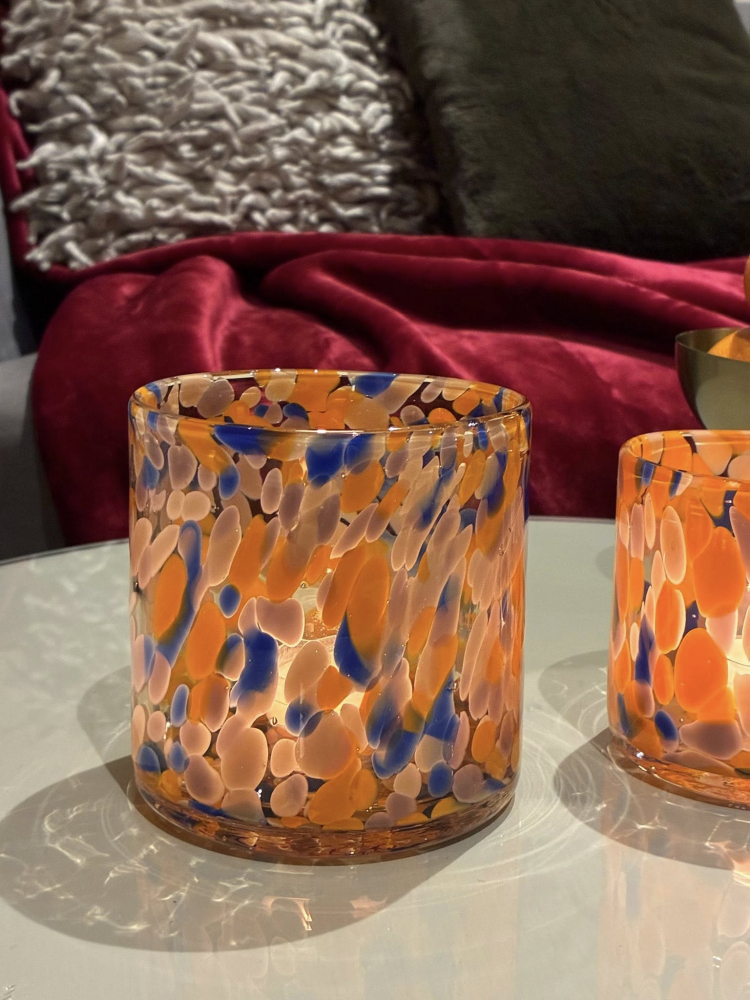 A playful yet elegant yolk yellow and blue spotty glass tealight holder, where hand-blown glass is scattered with Bright blue & yolk yellow dots.