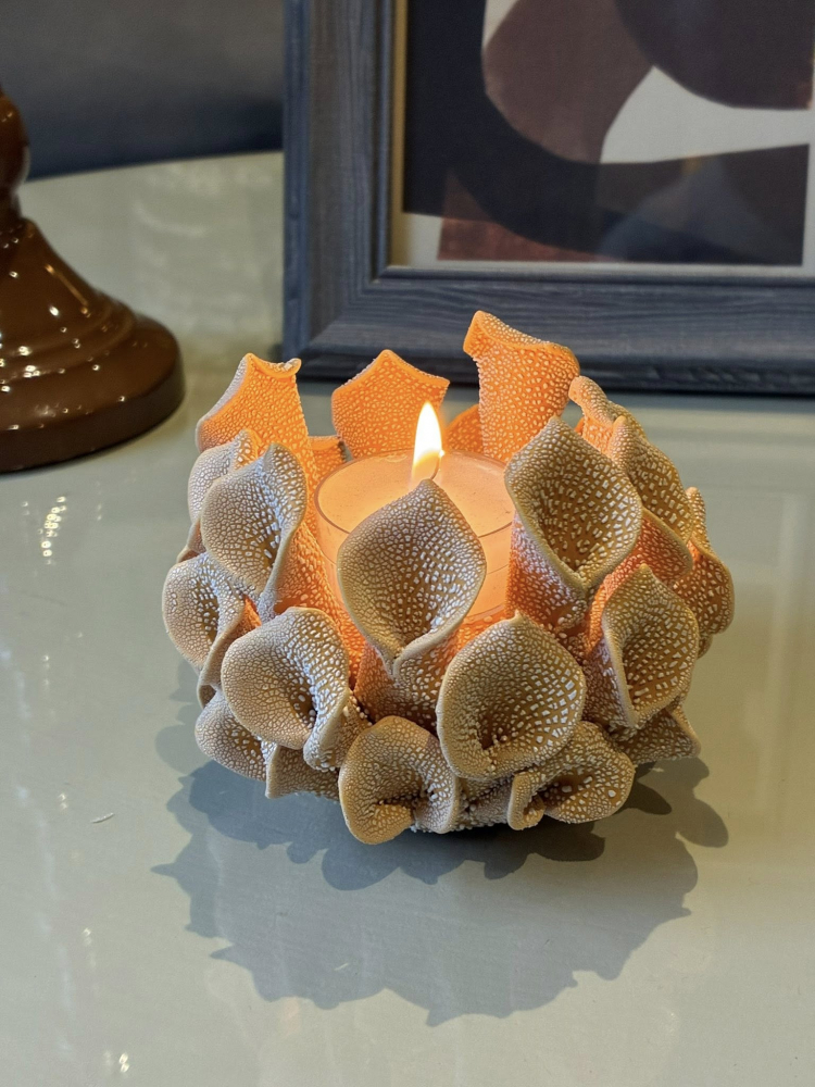 A charming porcelain tealight holder in an enchanting mushroom design, finished in a soft mustard hue.