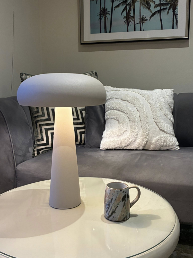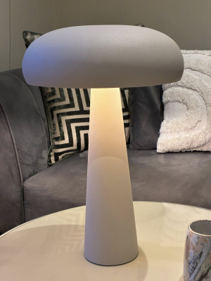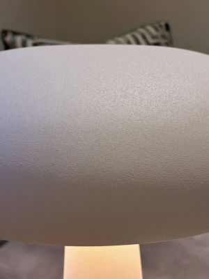 A sleek mushroom-shaped lamp in a soft matte pebble grey finish, combining sculptural form with understated elegance.