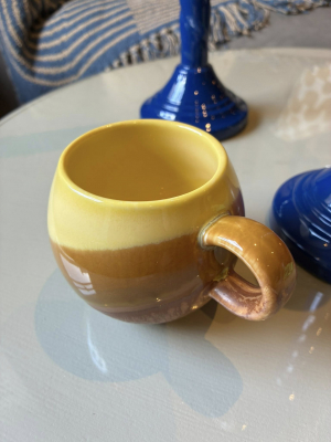 A soft stripe of sunny yellow wraps gently around the form, leading into a smooth caramel glaze that gradually deepens into a rich, distressed brown at the base.
