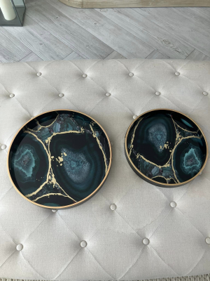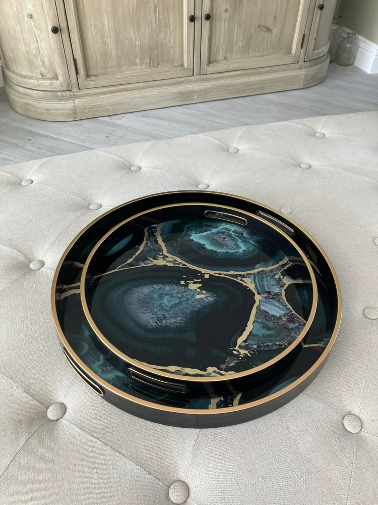 Teal to midnight in a perfect mix of black blue teal and gold, crafted from resin edges with a golden rim for a finished look.