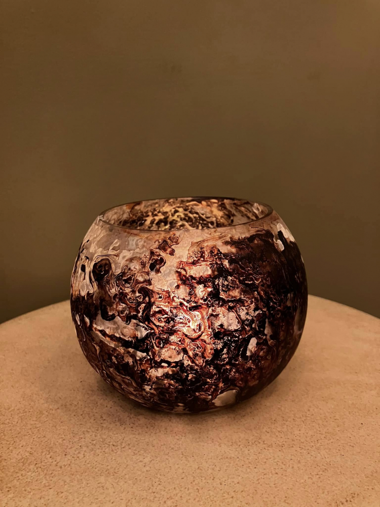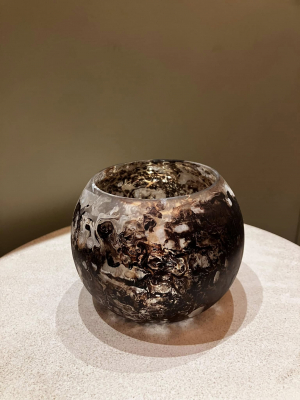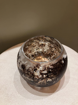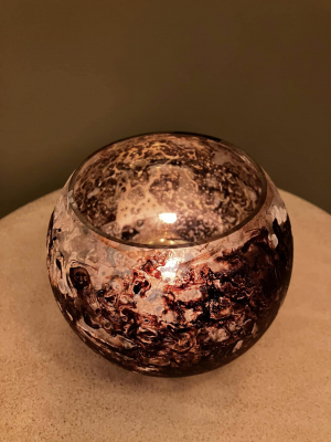 Glass T-light holder. Brown and white marble effect on the outside. Golden glow on the inside. Height 8.5cm Width 10.5cm