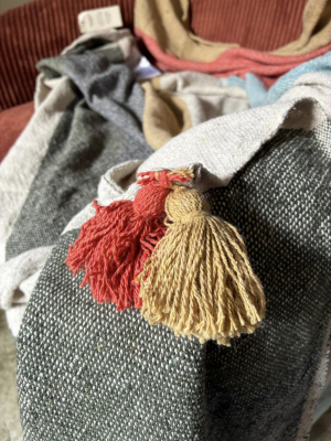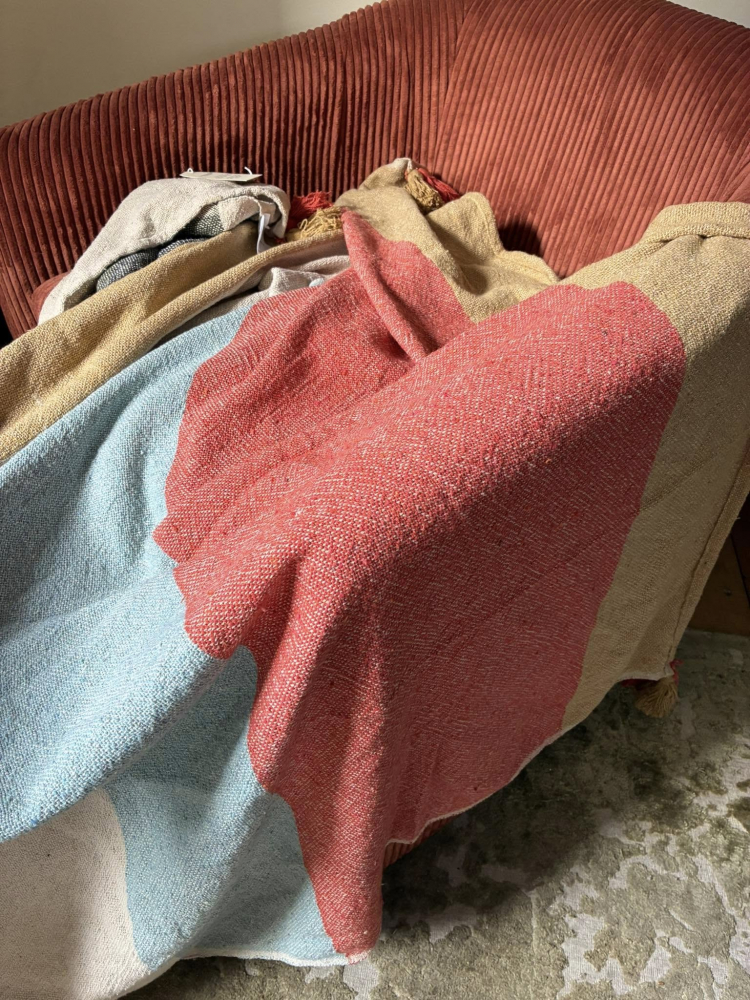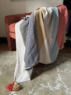The throw is adorned with light fringes, which contribute to a warm and cozy atmosphere at home.
