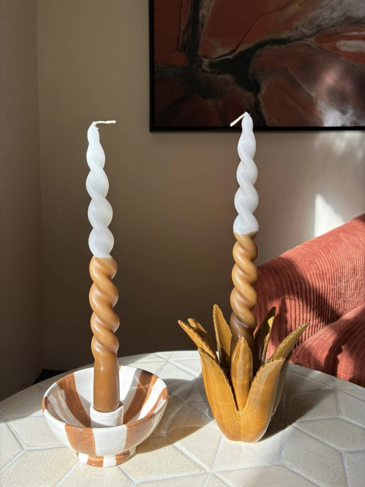 Pair of Twist dinner candles dipped in a mustard colour.