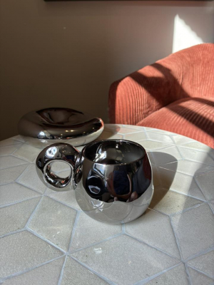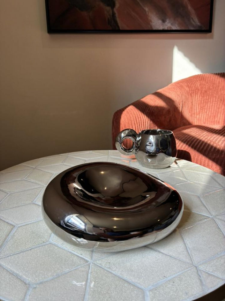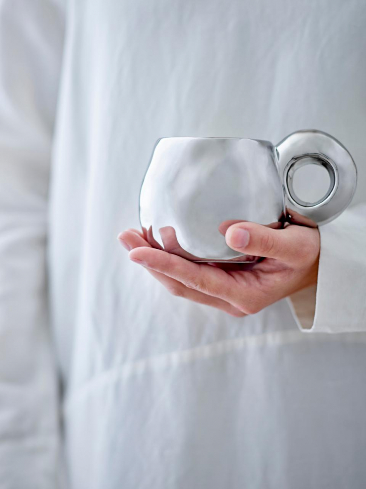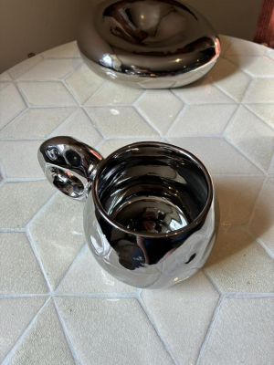 The Galactic Mup is a unique cup with a galvanized surface that gives it a shiny chrome finish. The large, round handle adds a decorative element, making the cup a stylish addition to the kitchen and a beautiful accent on a cup shelf.
