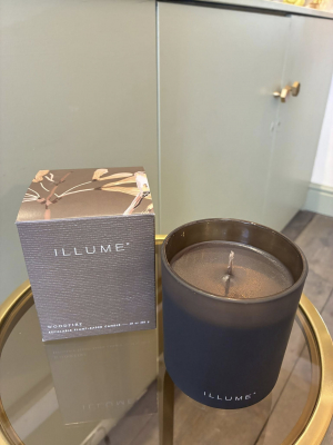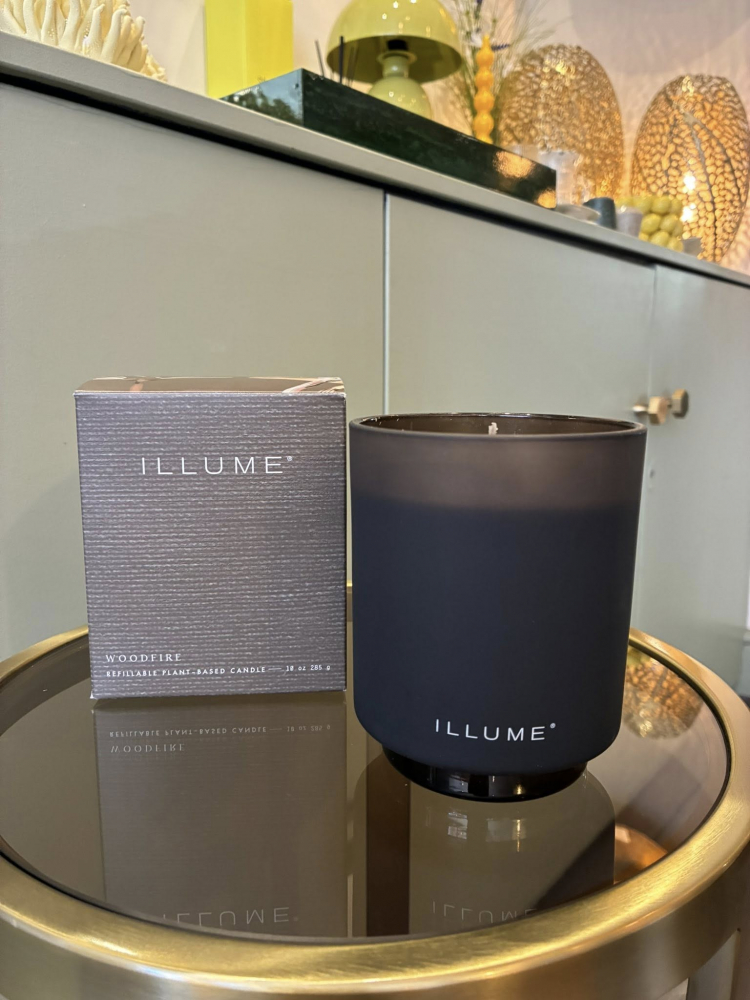 Woodfire Candle in a lovly matt glass vessel, with gift box. Grounded in smoky cedar with a heart of suede kissed with earthy amber. 285 G. - 50 Hours - D9xH10,7 cm 100% Plant Based Wax