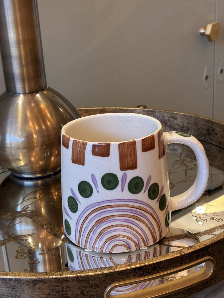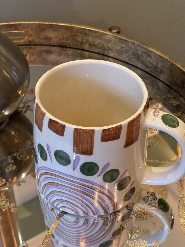 A fun hand painted mug. Cream Green & Tan brush strokes.