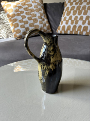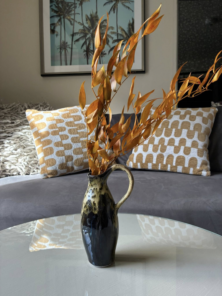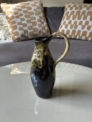A striking handmade jug vase where deep ocean navy meets a vibrant yellow top. The bold contrast of colours creates a dramatic, eye-catching piece, while the handcrafted finish ensures each vase is unique. Perfect as a statement accent on its own or styled with fresh or dried blooms.”