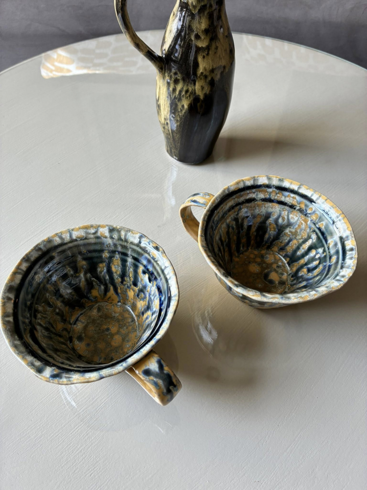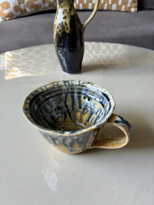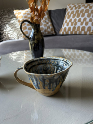 This handcrafted Mug features a beautiful reactive glaze with yellow and blue hues, highlighted by pearlescent details. The natural variations in the glaze make each cup unique, adding personality to each piece. The cup is ideal as a colorful addition to the table setting and looks lovely on a cup shelf when not in use.