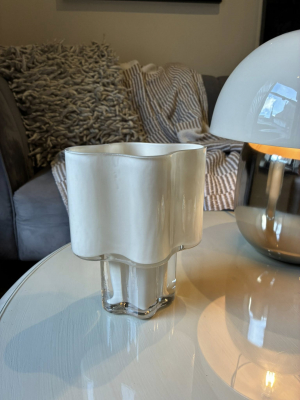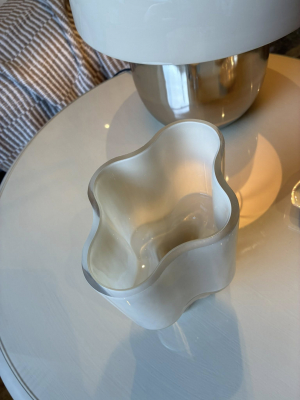 A white glass vase with a waved retro-modern silhouette, this piece blends mid-century charm with contemporary elegance.
