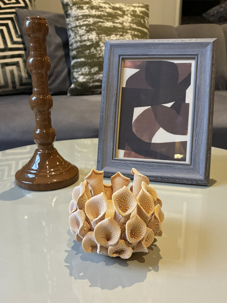 Its textured surface and softly curved silhouette bring a playful yet sophisticated touch to any shelf, side table, or bedside. When lit, it casts a warm, cosy glow that enhances its whimsical character.