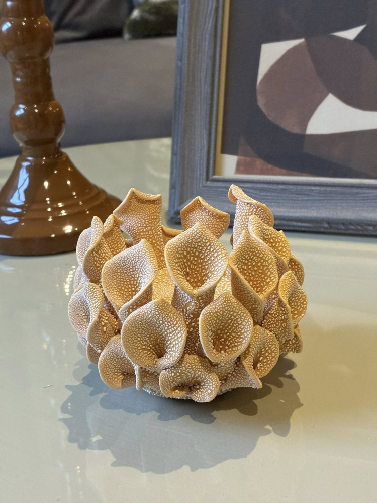 A charming porcelain tealight holder in an enchanting mushroom design, finished in a soft mustard hue.