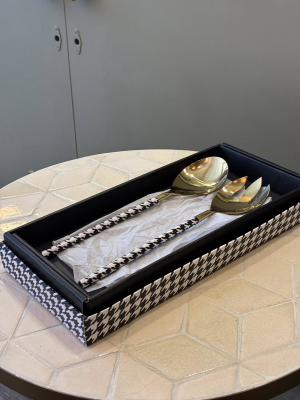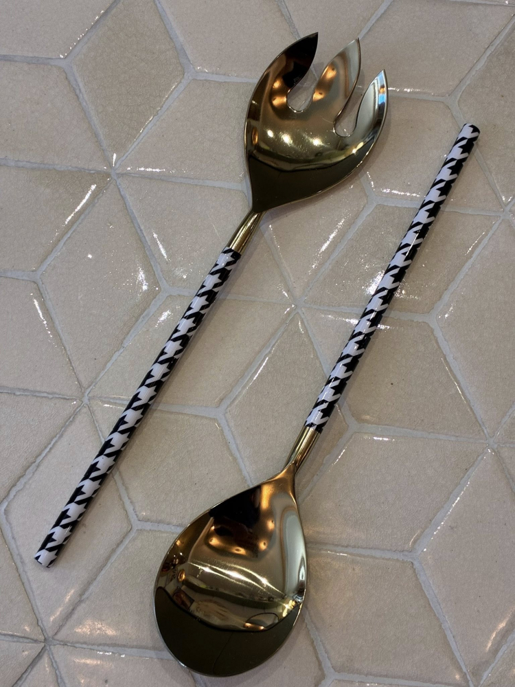 A striking pair of salad servers featuring a classic dog tooth pattern on the handles, bringing a tailored, heritage feel to your table setting.