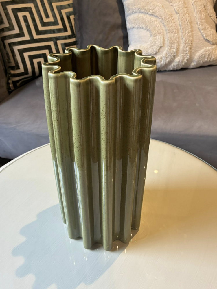 A striking ceramic vase in a rich green glaze, featuring a flowing wavy design that creates beautiful texture and visual interest.