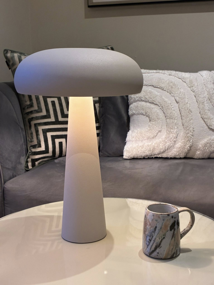 A sleek mushroom-shaped lamp in a soft matte pebble grey finish, combining sculptural form with understated elegance.