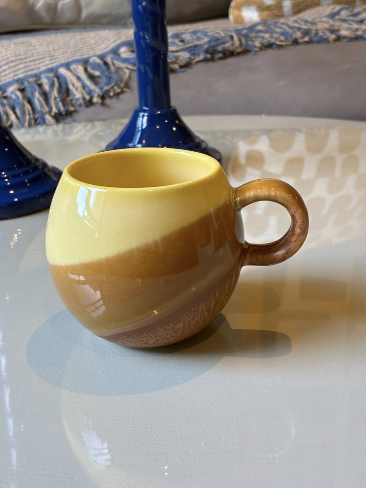 A soft stripe of sunny yellow wraps gently around the form, leading into a smooth caramel glaze that gradually deepens into a rich, distressed brown at the base.