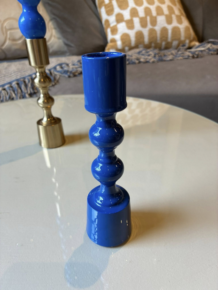 Make a statement with this solid metal candlestick, finished in a Laquared Colbalt blue that brings warmth and subtle luxury to any setting.