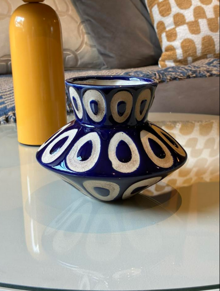 This Handmade vase features a narrow top and bottom contrasted by a wider midsection. It is finished with a glossy blue waxed glaze and decorated with beige oval motifs. Small variations in pattern and colour intensity may occur, making each vase unique.