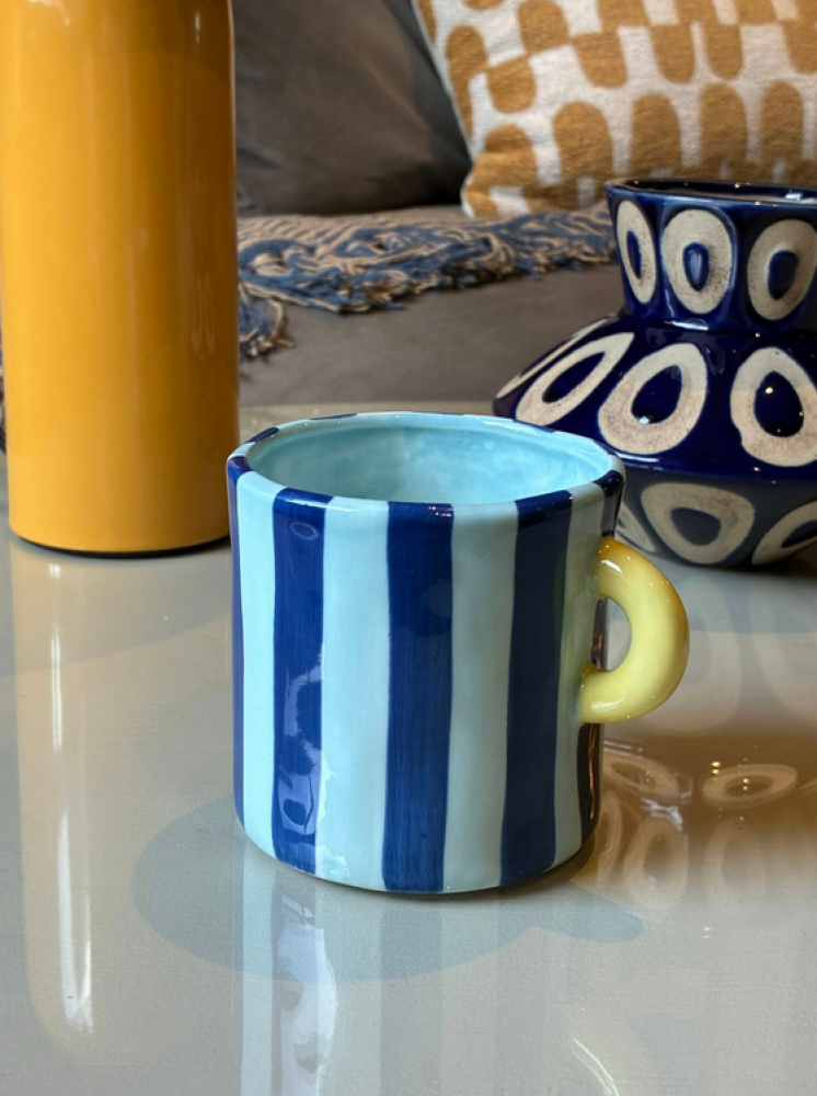 A charming handmade mug featuring soft, painterly stripes in deep navy and gentle light blue.