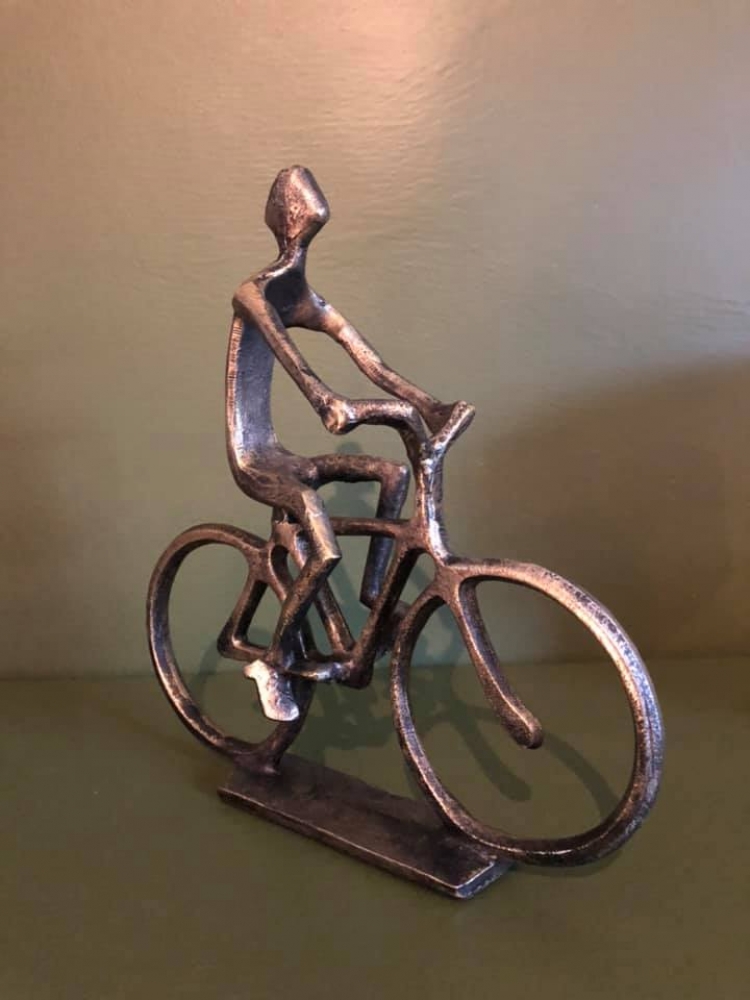 Modern sculpture of a cyclist in aged Bronzed Iron Metal finish Height: 24cm Width: 8cm