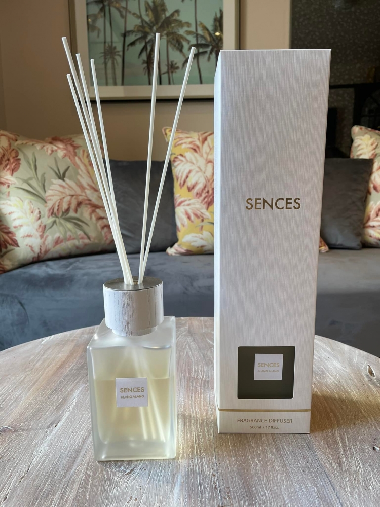 A fabulously fresh scent. Think White Musk, Fresh Blossom, with a fresh water spritz! The height of the diffuser with the sticks is 40cm 500ml