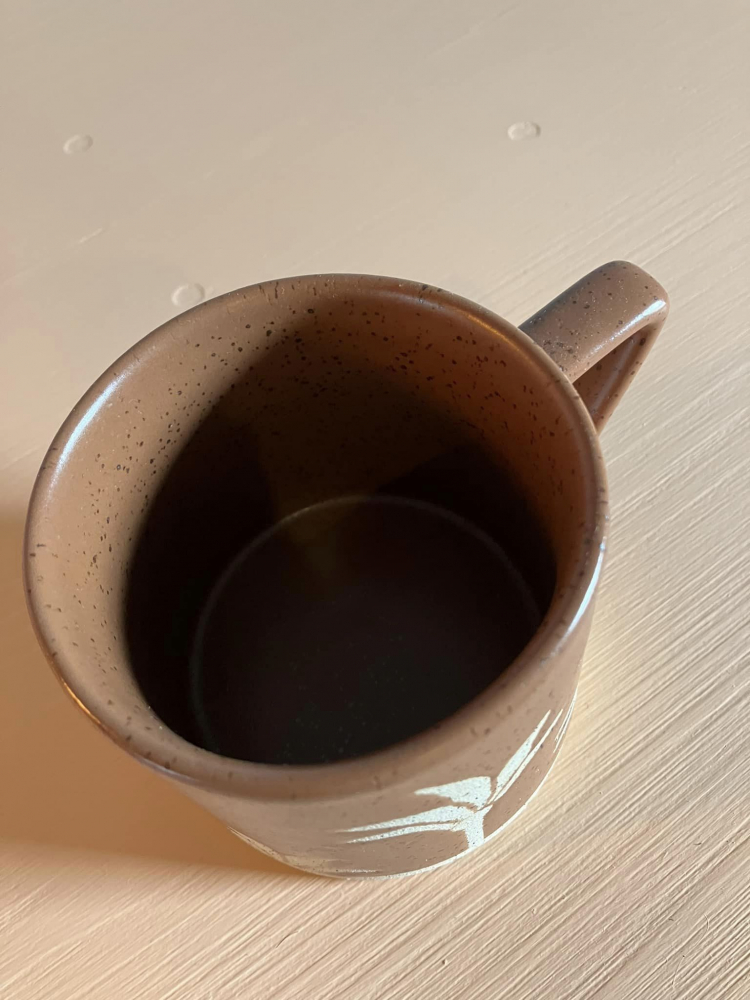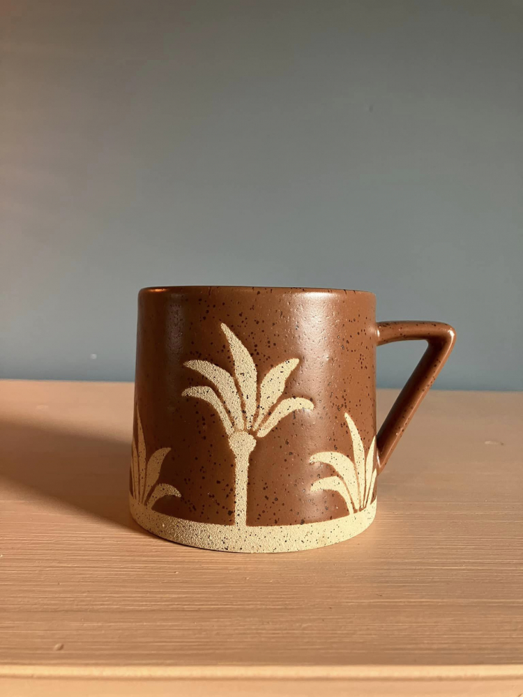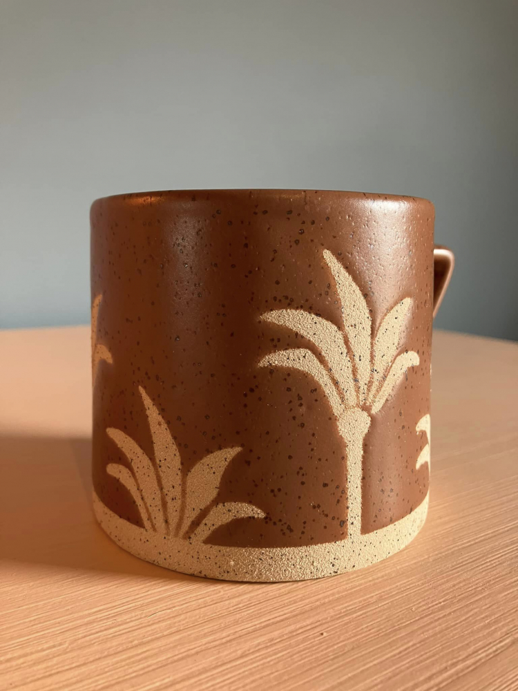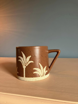 Terrercotta Mug with abstract corner handle. Palm textured pettern & Bottom of mug. Microvave & Dishwasher safe. 8.5cm Height 12cm Width with Handle