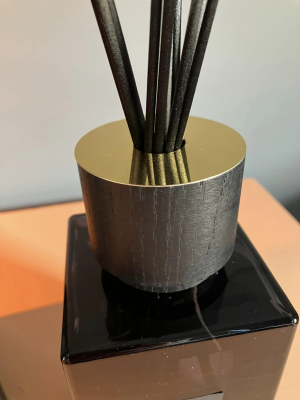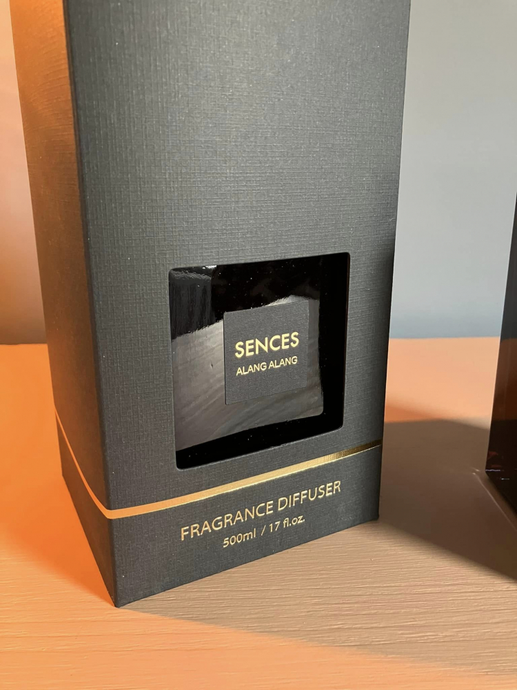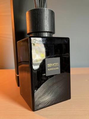 Beautfily presented in a navy blue glass bottle with a black wooden top, finished with a golden rim.