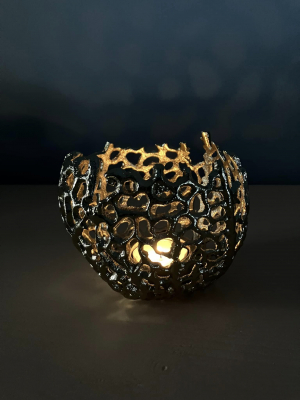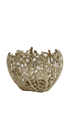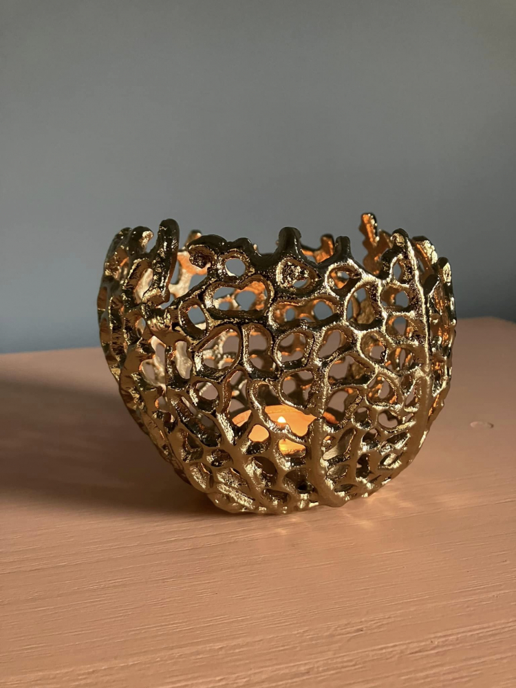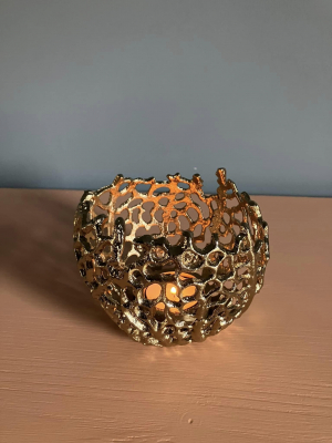 Our gorgous Corala range also comes in T-Light. Wonderful Golden Glow reflects inside the t-light with the golden metal. Width 12 cm Height 10 cm Color Gold Shape Round Material Metal