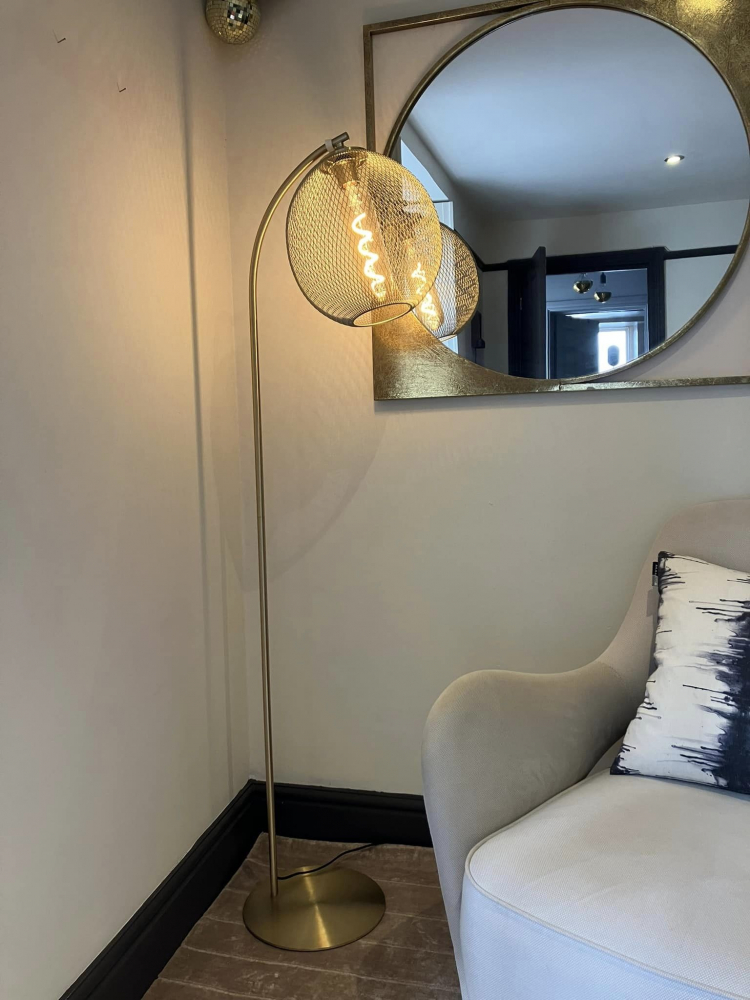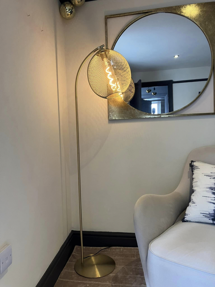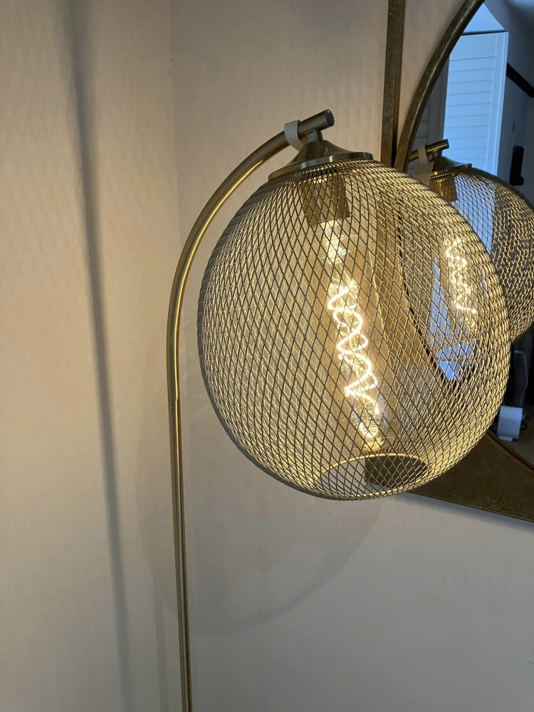 The Mesh Metal shade of the lamp diffuses the light but also glows with the light reflecting.