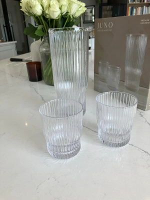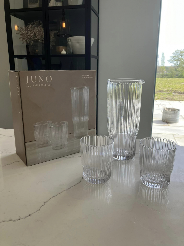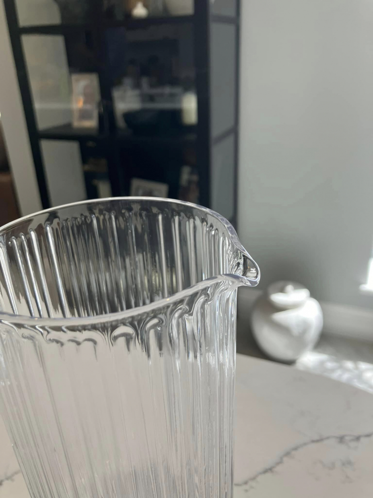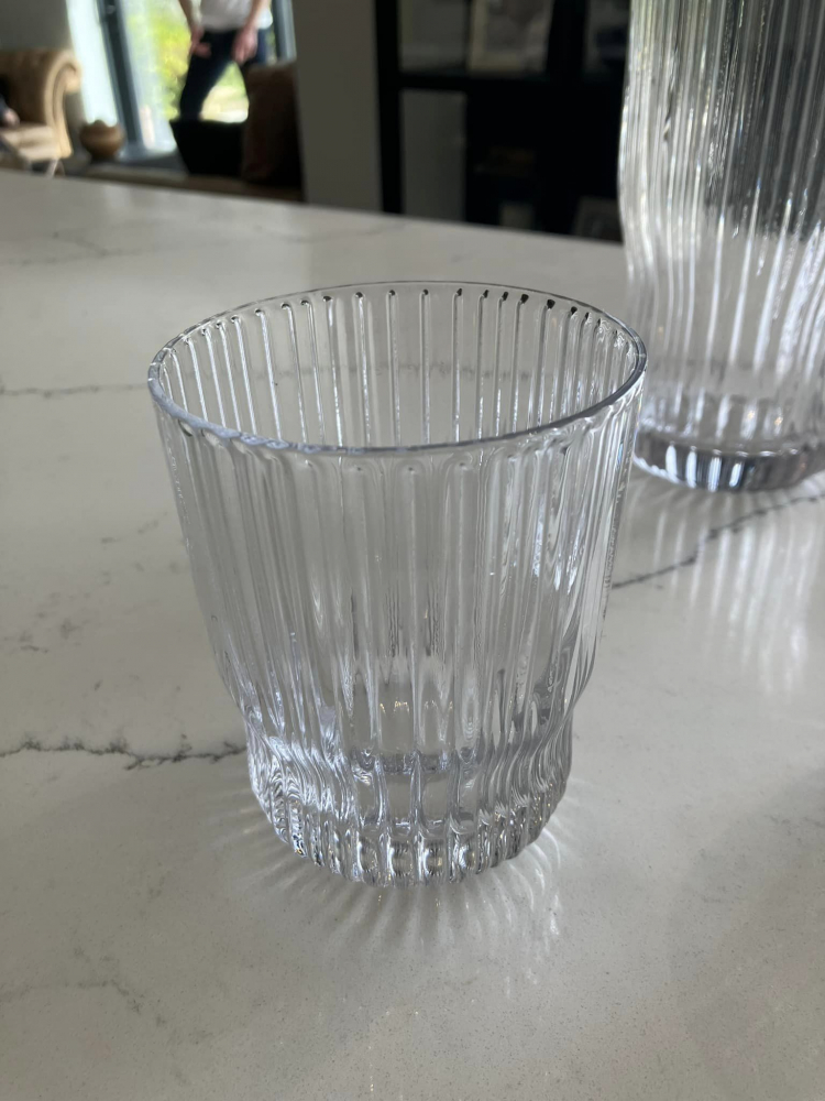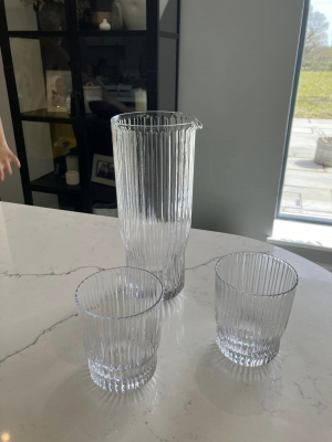 Meet the Ribbed Glass Carafe with its two trusty sidekicks, the Tumblers. This dynamic trio is like the cool squad that rolls into the party and instantly steals the show.