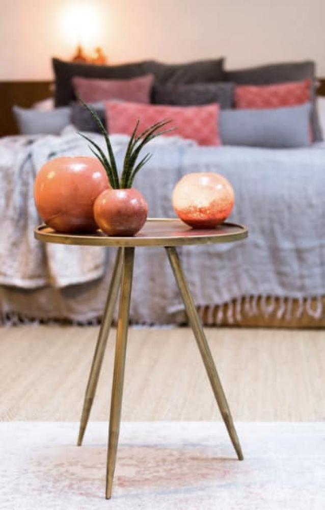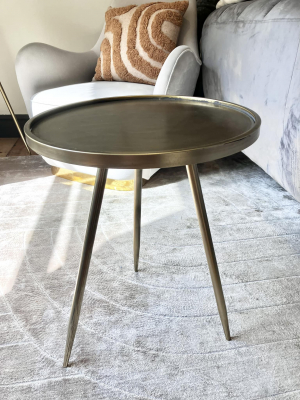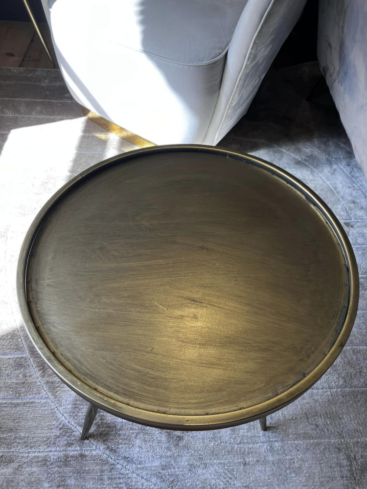 Great Tripod table in a distressed golden colour. Easy screw on and off legs for assembling. Take the legs off for easy storage flat when not needed. Material Content: iron Height: 50cm Width: 39cm