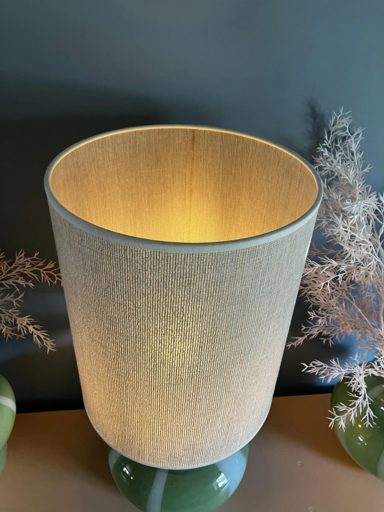 This lamp comes with a tall oat colour lamp shade.